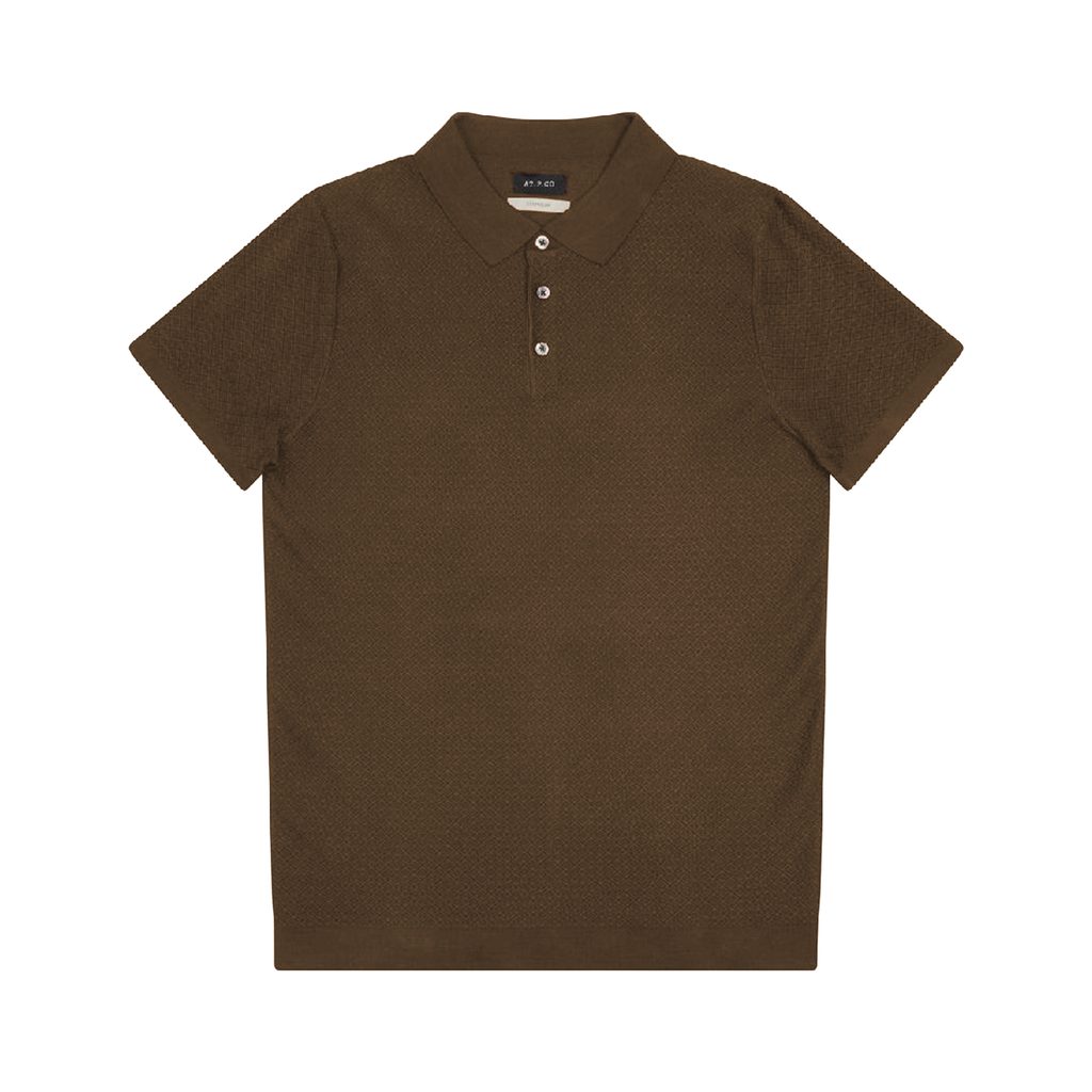 Męska koszulka polo włoskiej marki AT.P.CO z krótkim rękawem z dzianiny bawełniano-modalowej. Właśnie dzięki domieszce modalu, mimo dzianinowej faktury, koszulka jest gładka w dotyku, co sprawia, że latem jest przyjemniejsza dla skóry – a to czasem jest potrzebne. Kołnierzyk i zapięcie są klasyczne, krój jest ogólnie luźny, a dzięki brązowemu kolorowi ten model wygląda ładnie w stylu old money.