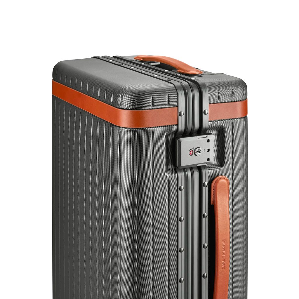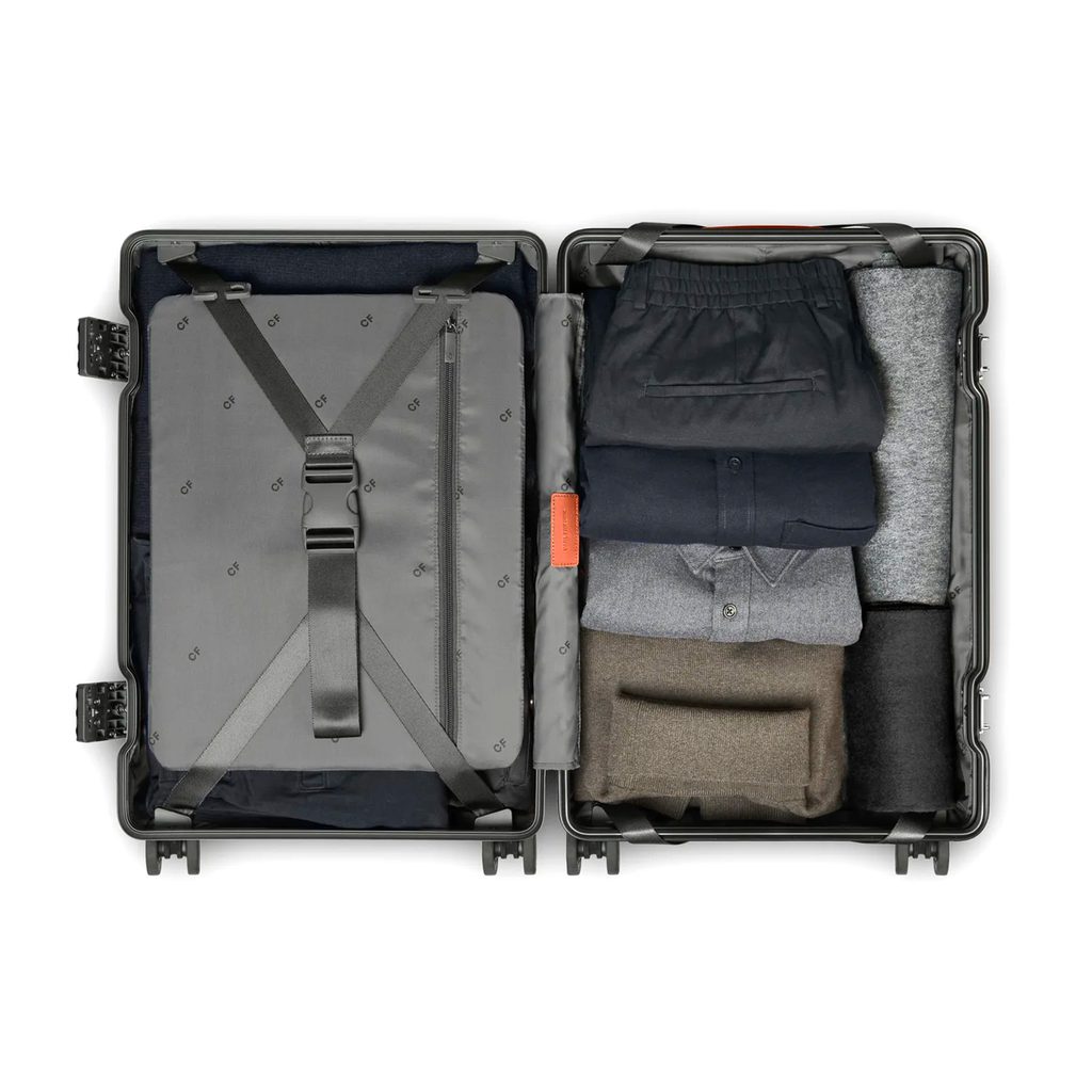 Stylowa, a jednocześnie wytrzymała i funkcjonalna walizka podróżna Carl Friderik, która spełnia wymagania dotyczące bagażu pokładowego większości linii lotniczych.