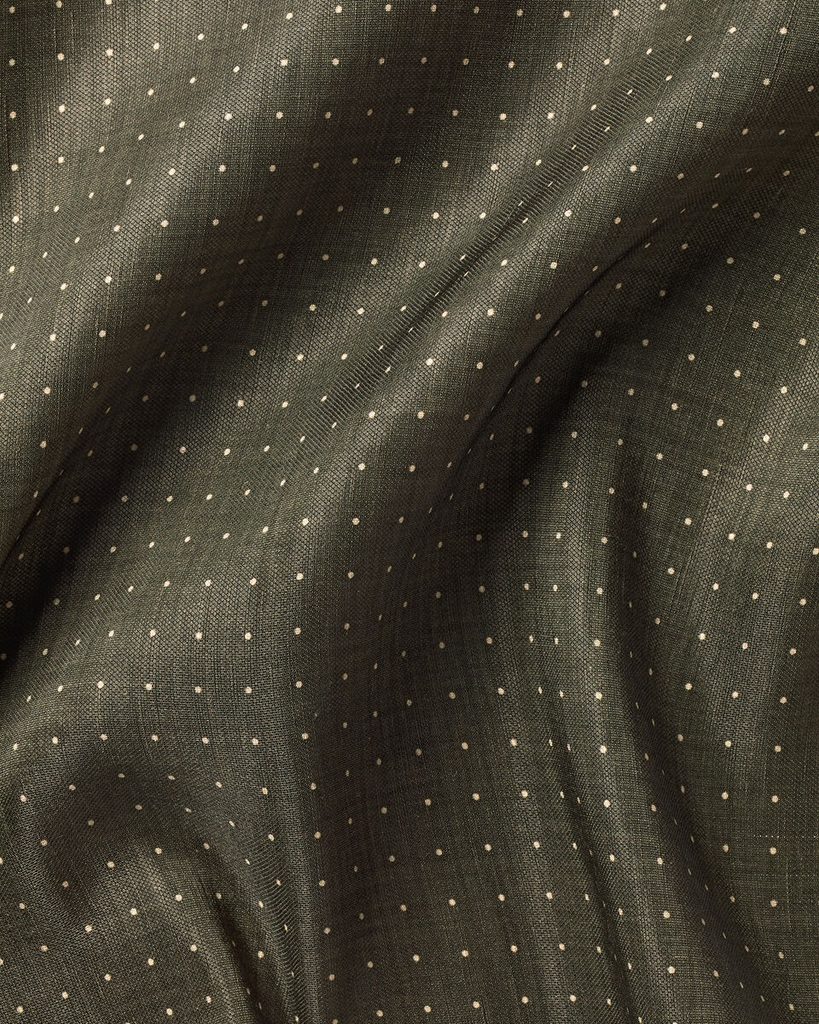Już przy pierwszym dotknięciu czuć, że to wysokiej jakości poszetka z mieszanki lnu i jedwabiu, idealna do letnich marynarek, a do tego ozdobiona drobnym wzorem w kropki i lamówką.