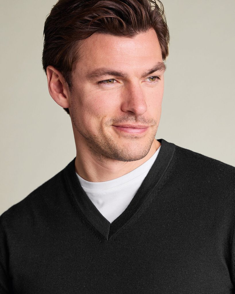 Klasyczny sweter z dekoltem w kształcie litery V, wykonany z miękkiej wełny merino, który doskonale łączy elegancki wygląd z praktycznością. Dzięki naturalnej oddychalności i regulacji temperatury świetnie nadaje się zarówno pod marynarkę, jak i tylko na koszulę. Jest lekki, ale dzięki wełnie cudownie ogrzewa, można go nosić od jesieni do wiosny lub podczas letnich ulew. A te bywają.