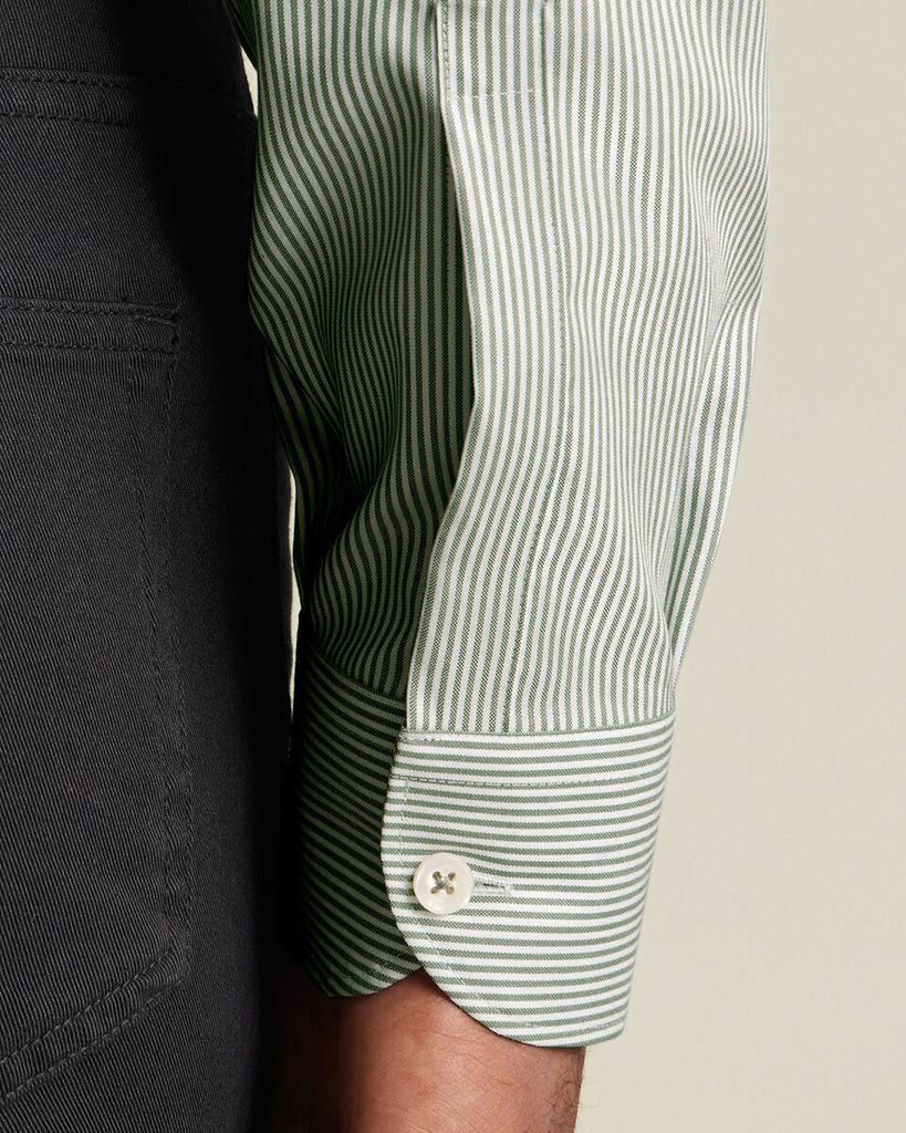 Zielona koszula w paski Charles Tyrwhitt, która wnosi powiew świeżości i lekkości do klasycznego fasonu. Dzięki subtelnemym paskom wygląda ciekawie, ale wciąż wystarczająco elegancko, zarówno do biura, jak i na co dzień w mieście.