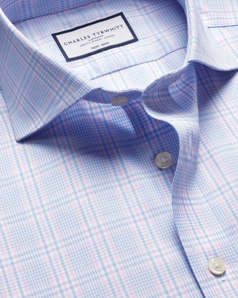 Koszula Charles Tyrwhitt wsubtelny wzór w kratkę w odcieniach błękitu i różu, wnosi powiew świeżości i lekkości do klasycznej elegancji. Wygląda schludnie, ale jednocześnie swobodnie – idealnie na dni, kiedy chcesz wyglądać stylowo, ale bez formalności.