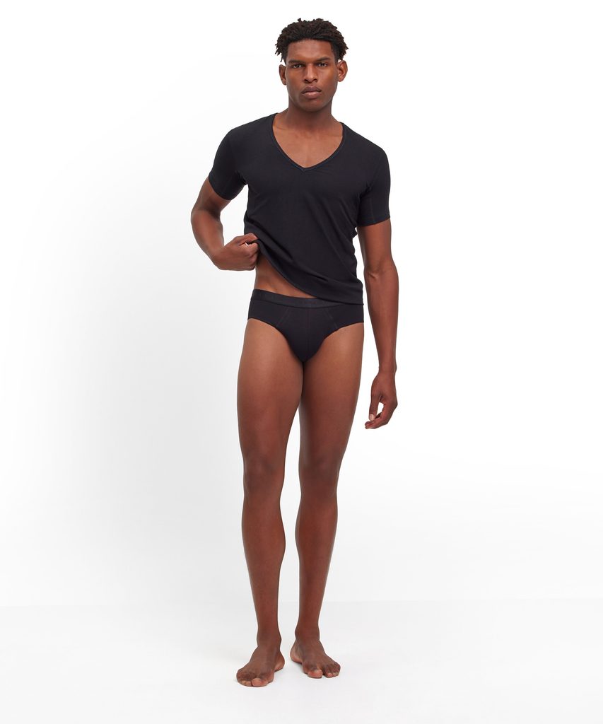 Czarne slipy z egipskiej bawełny i wiskozy, których główną zaletą jest technologia Outlast®, która zapewnia komfort termiczny jak mało co. Zatrzymuje nadmiar ciepła z ciała i - gdy ciało ponownie się ochładza - uwalnia je z powrotem. W ten sposób niemal cudownie zapobiega poceniu się.