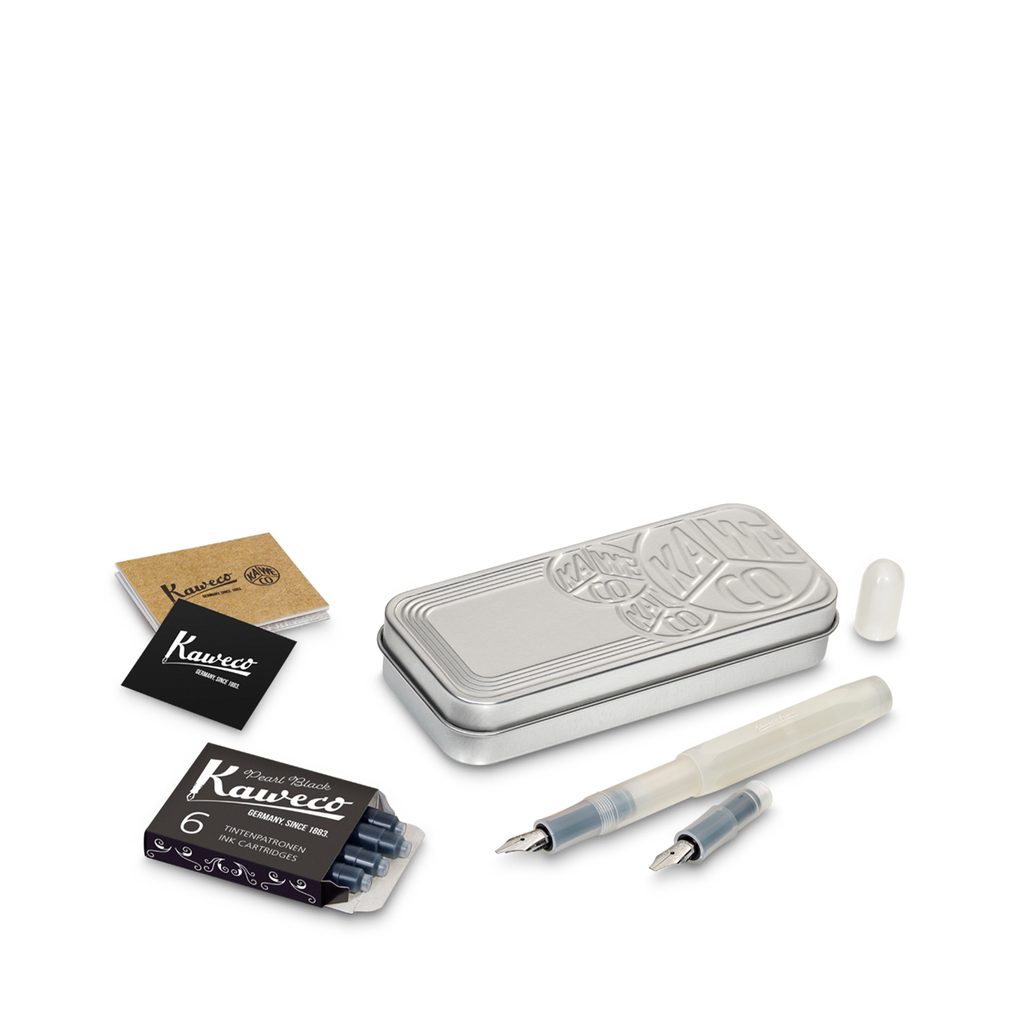Zestaw do kaligrafii, w którym znajdziesz minimalistyczną wersję legendarnego pióra wiecznego Kaweco z dwoma końcówkami – 1,5 mm i 2,3 mm. Uzupełniony pakietem 6 czarnych nabojów i zapakowany w blaszaną puszkę w stylu retro.