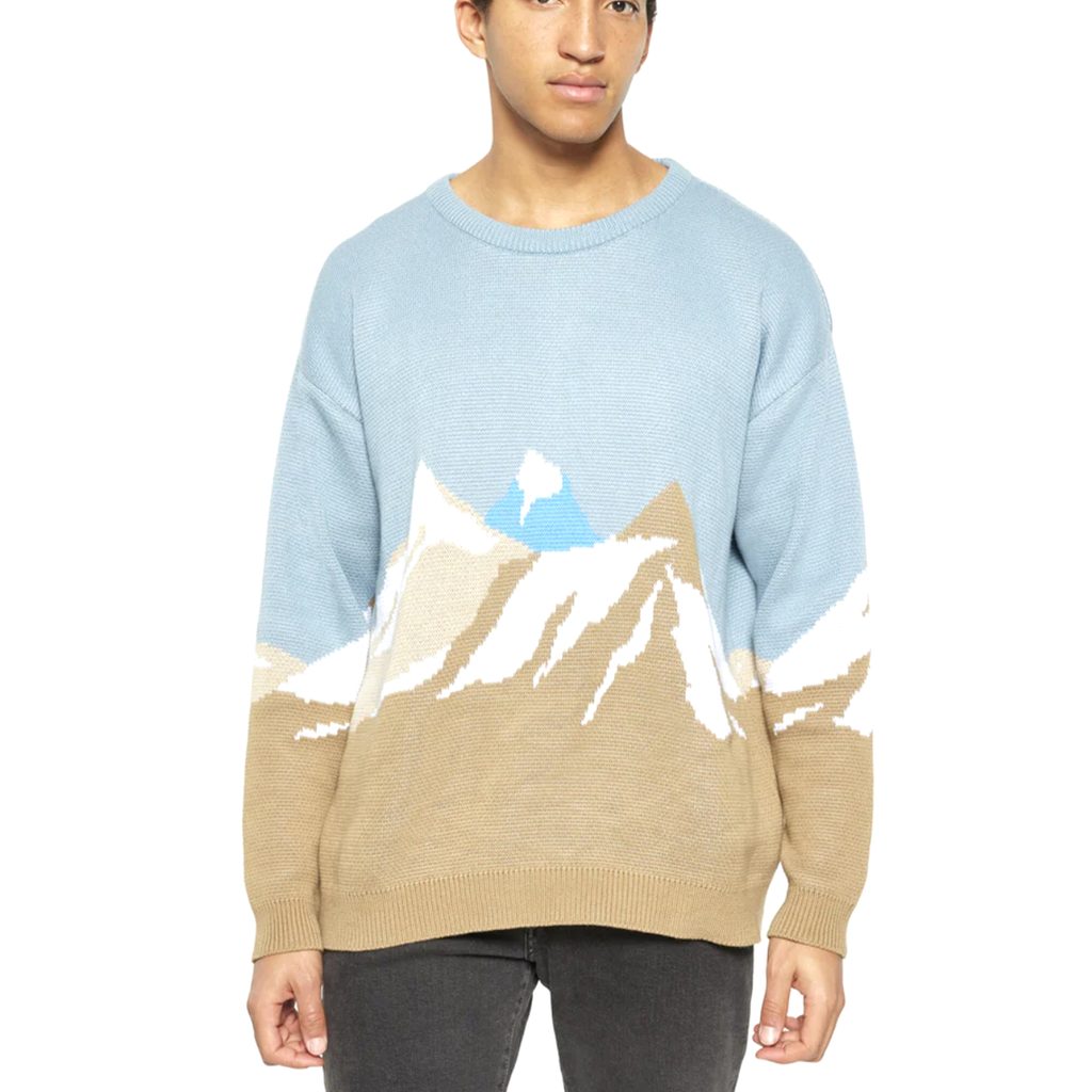 Jeśli hołdujesz panoramom w domowym zaciszu, ten sweter jest dla Ciebie. Górskie podnóża w kolorze musztardowym, śnieżnobiałe grzbiety i błękitne niebo to wprawdzie nieco niezwykłe znalezisko na swetrze, ale tym bardziej cenne. Wykonany z czystej bawełny organicznej o wygodnym, luźnym kroju.