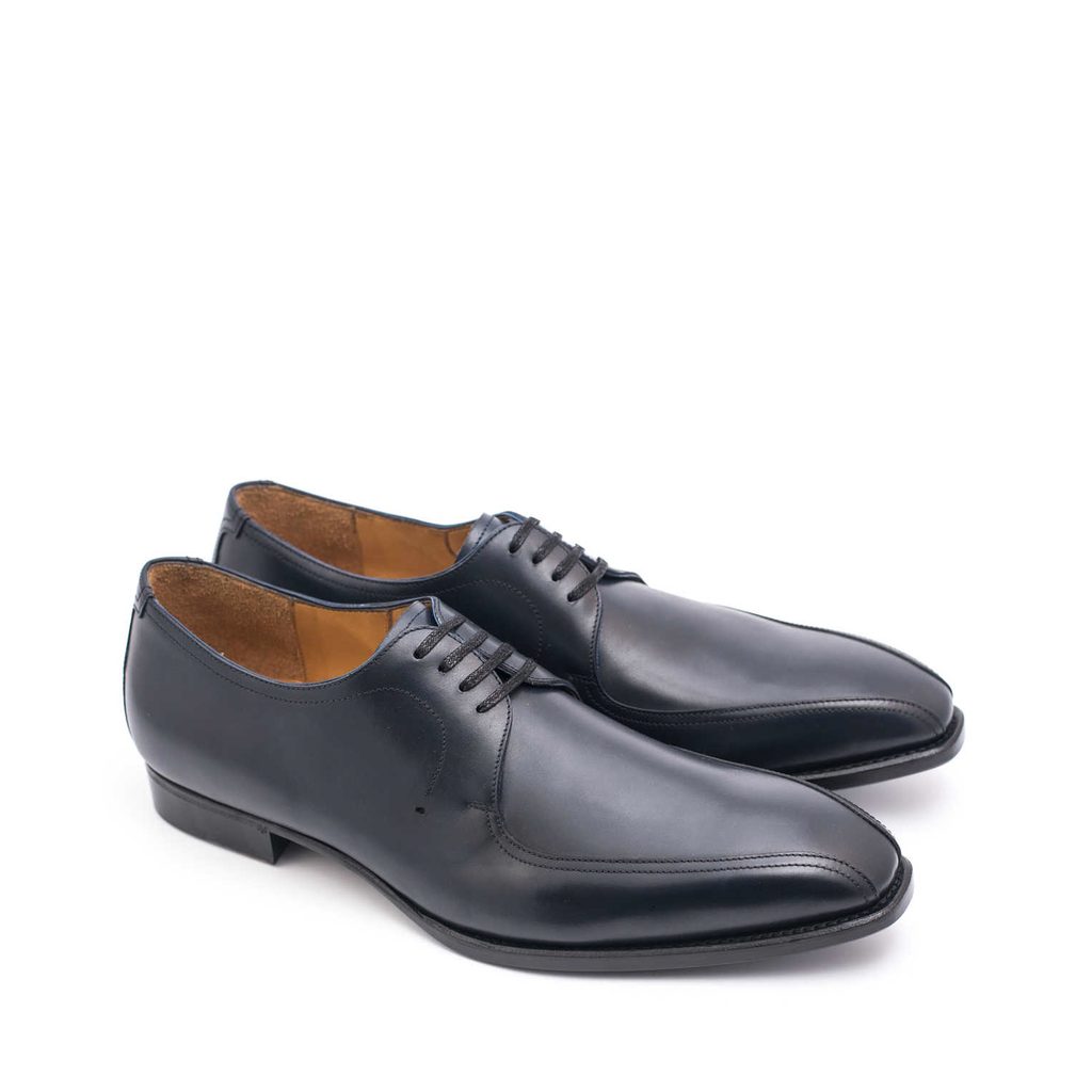 Mniej formalne buty derby - czyli półbuty z otwartym sznurowaniem - z ładnym szwem wzdłuż łuku podbicia. Dzięki starannemu projektowi, a mianowicie wysokiemu podbiciu i szerszej części na palcach, są one niezwykle wygodne. Wykonane są wyłącznie z najlepszej francuskiej skóry, tutaj w subtelnym kolorze granatowym.