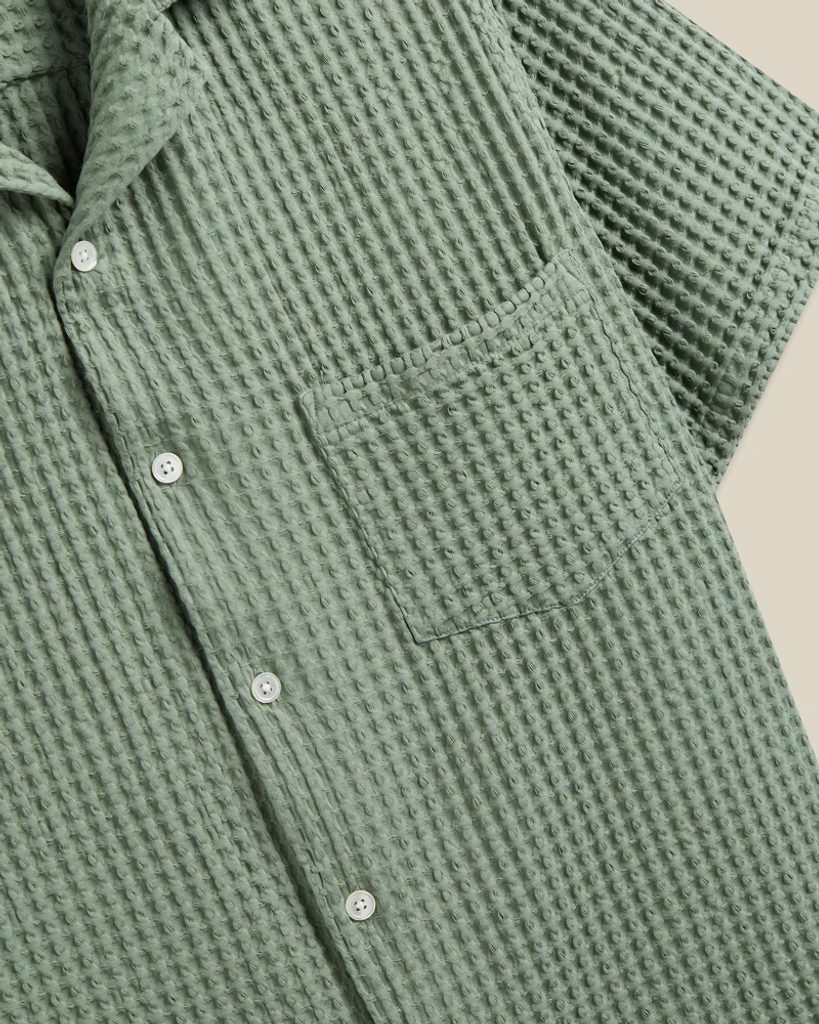 W tegorocznej letniej kolekcji Portuguese Flannel koszula Cornelius jest nieco mniej „letnia”, za to o wiele bardziej charakterystyczna i świeża. Dominuje w niej waflowa struktura zastosowanej bawełny w świeżym zielonym kolorze. Wszystko inne pozostaje jednak tak, jak lubimy najbardziej: luźniejszy krój, elegancki płaski kołnierzyk, perłowe guziki i rodzinna włoska produkcja.