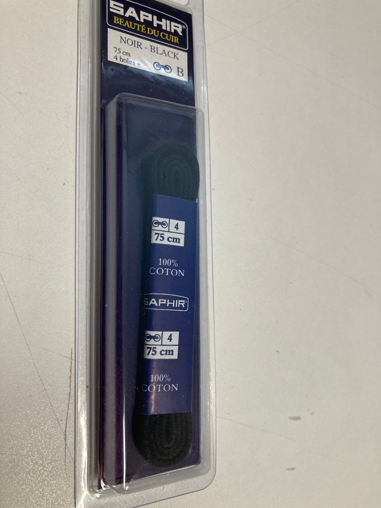 Bawełniane sznurowadła francuskiej marki Saphir. Kolor czarny, okrągłe, cienkie.