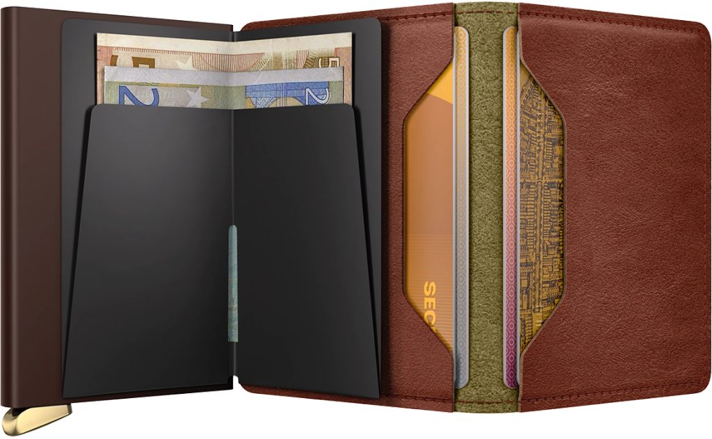 W tym smukłym, ale luksusowo wykonanym portfelu prym wiedzie miejsce na karty – bez nich praktycznie nie da się dziś żyć. Dlatego sercem portfela Secrid jest lekkie i cienkie aluminiowe etui. Pomieści ono od 4 do 6 kart, w zależności od tego, czy są one tłoczone, czy nie. Dostęp do nich jest łatwy – za pomocą plastikowego mechanizmu wysuwania. Dzięki opatentowanej konstrukcji i zastosowanym materiałom etui zapewnia również ochronę RFID przed zdalnym skopiowaniem kart.