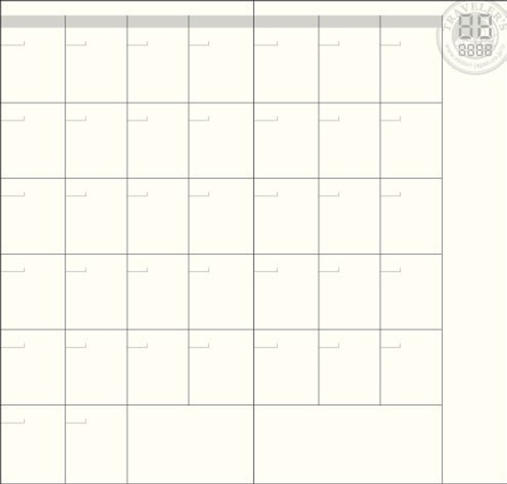 Kalendarz miesięczny – wkład do notatnika dla podróżników Traveler's Notebook. Kiedy warto kupić? Jeśli chcesz mieć praktyczny dziennik, który nie ma nadrukowanych danych. Poszczególne dni wpisz do kwadratowych okienek.