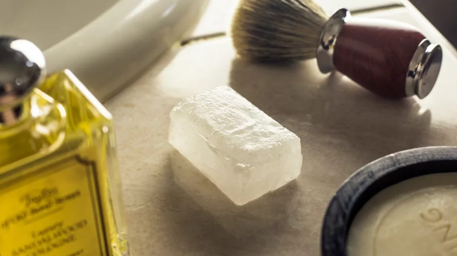To ałun. Ałun jest minerałem powstałym w wyniku utleniania naturalnego aluminium potasu. Egipcjanie używali tego sprytnego kamyka już 4000 lat temu. I prawdopodobnie twój dziadek całkiem niedawno. Im również podczas golenia czasem zjechała ręka, więc naprawdę nie ma się czego wstydzić. Kiedy tak się stanie, wystarczy zwilżyć skórę i przyłożyć ałun. Następuje piekący dezynfekujący moment, a następnie rana zostaje ściągnięta.